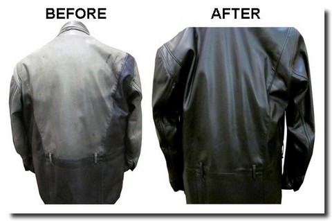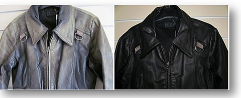 This black leather jacket required 2 different types of dye treatments due to the type of leather and severe fading.